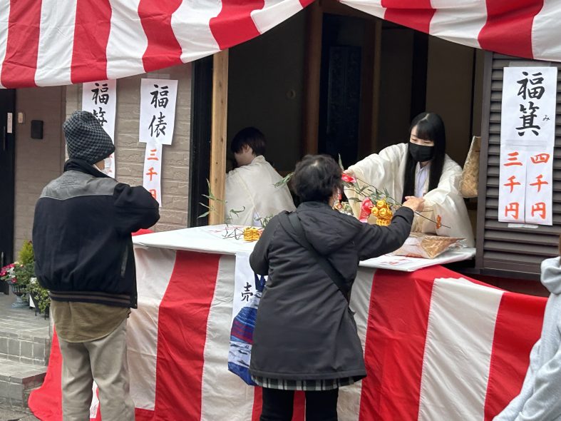 午前10時からは、「商売繁盛 笹もってこい!」のバックミュージックに乗せて、巫女の衣装に身を包んだ福娘が「熊手」や「福笹」などの縁起物を販売します。福娘の清楚な笑顔に不況を吹き飛ばす元気をもらった人も多いはずです。